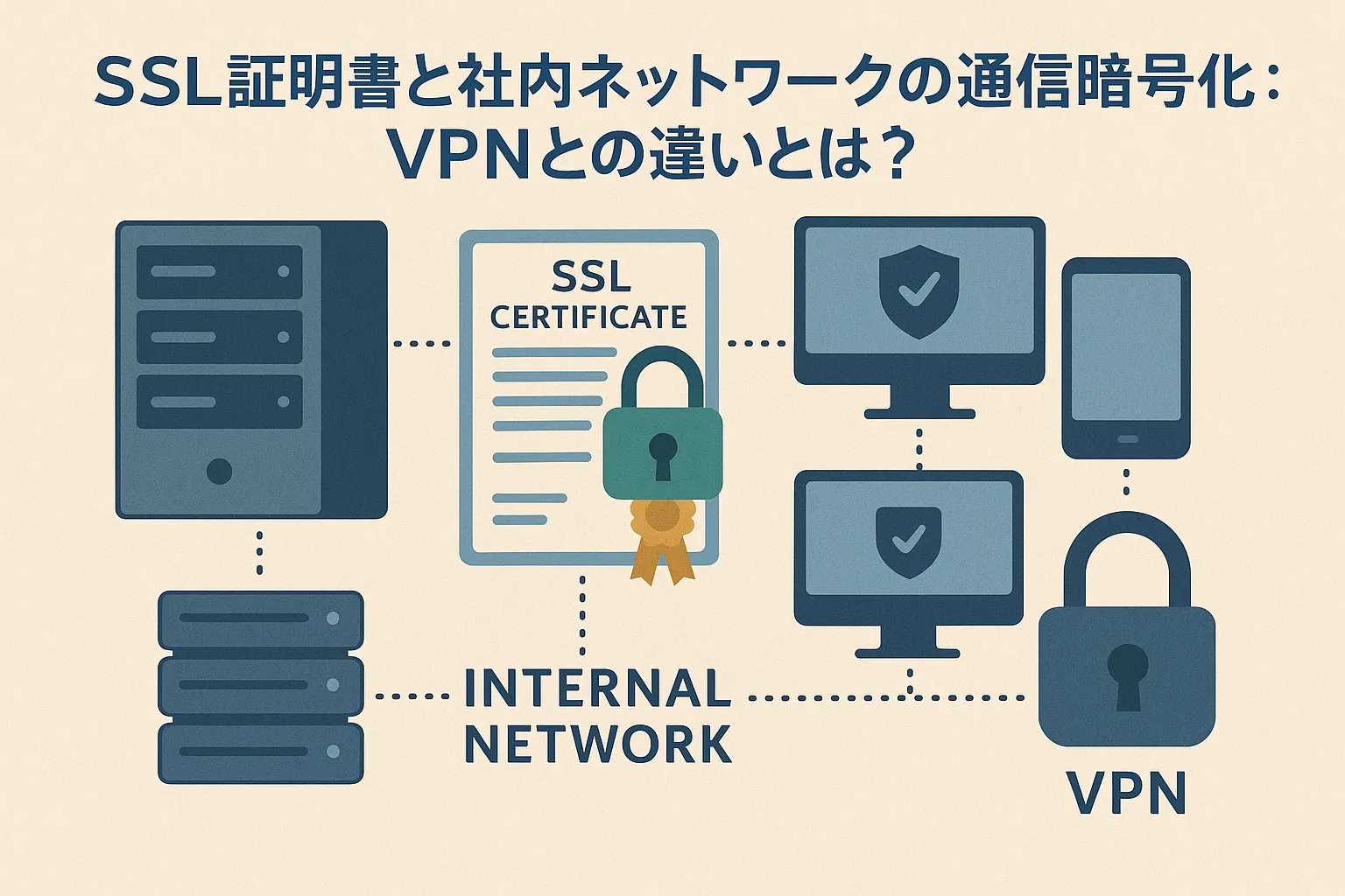 SSL証明書とVPNは、どちらも通信を暗号化する仕組みですが、その範囲と役割は異なります。特定のサービスだけを守りたい場合はSSL証明書、ネットワーク全体を守りたい場合はVPN、そして両方を組み合わせることでより強固なセキュリティが実現します。自社の状況に応じて適切に選びましょう。